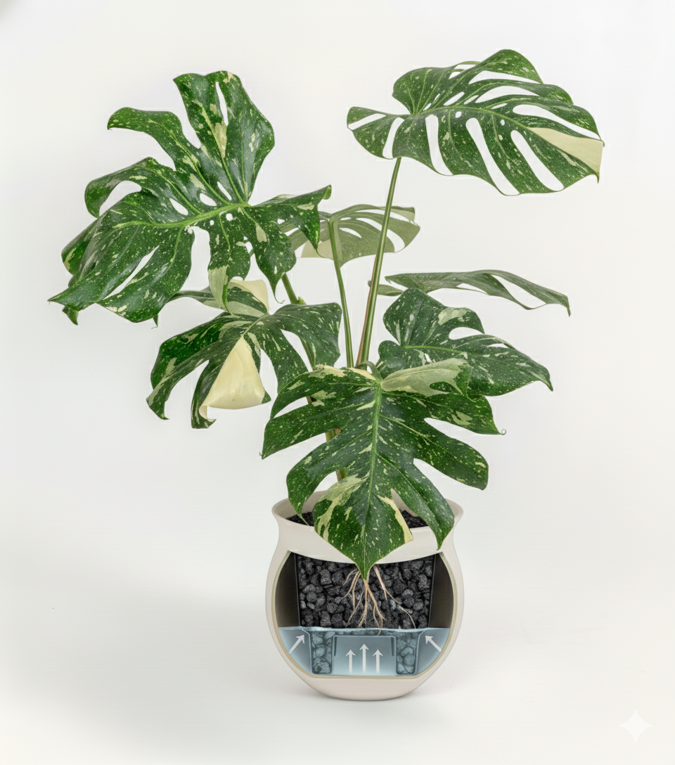 A hidden reservoir delivers steady hydration for weeks at a time.