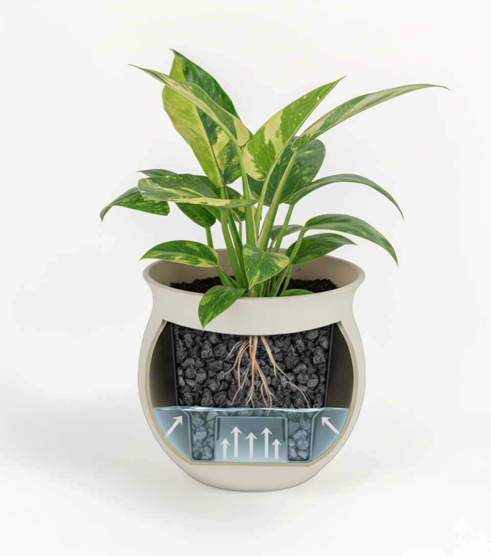 A hidden reservoir delivers steady hydration for weeks at a time.
