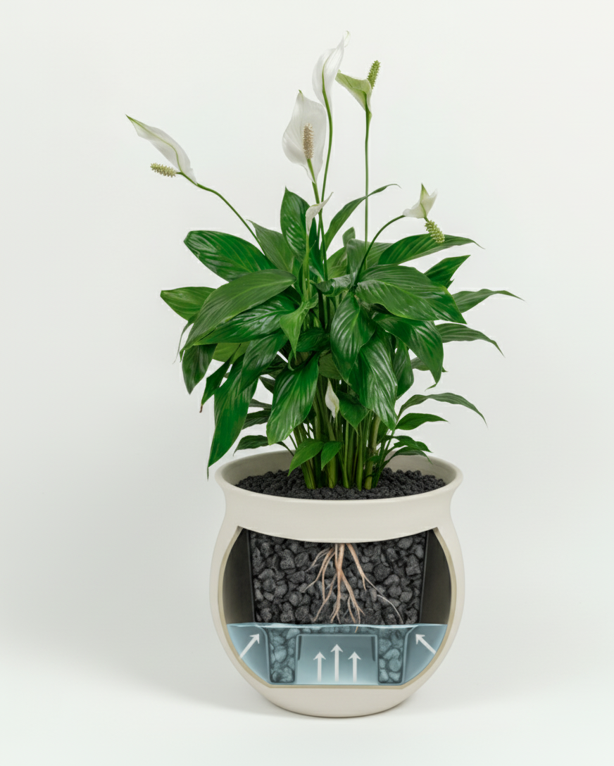 Plantwell pre-pots it in a self-watering planter so you can simply fill, relax and let the Peace Lily set the tone for serenity.